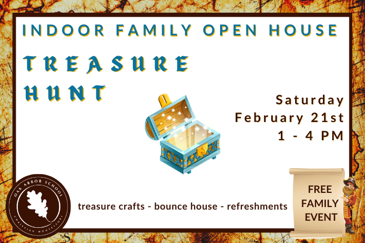 Set sail on a family-friendly Treasure Hunt Open House at Oak Arbor School. Children and parents will explore our campus through a guided treasure hunt, enjoy updated crafts, bounce in the bounce house, and share snacks along the way. This hands-on event is a fun and engaging way for families to tour classrooms, meet teachers, and experience Montessori learning in action.